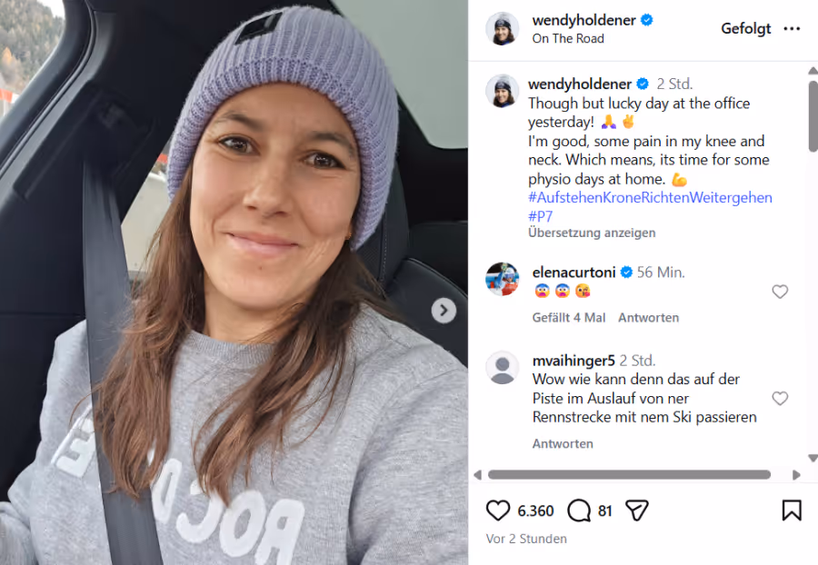 In ihrem Beitrag lächelt Holdener in die Kamera. «Mir geht es gut, ich habe nur etwas Schmerzen im Knie und am Nacken. Das bedeutet, dass es zuhause Zeit für ein paar Tage Physiotherapie wird», schreibt sie.