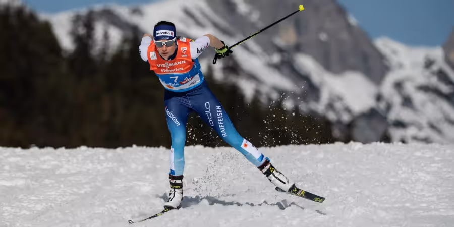 Von Siebenthal läuft im Sulzschnee angriffig. Das Leichtgewicht findet den Rhythmus früh und taucht bereits kurz nach dem Start in den Top Ten auf.