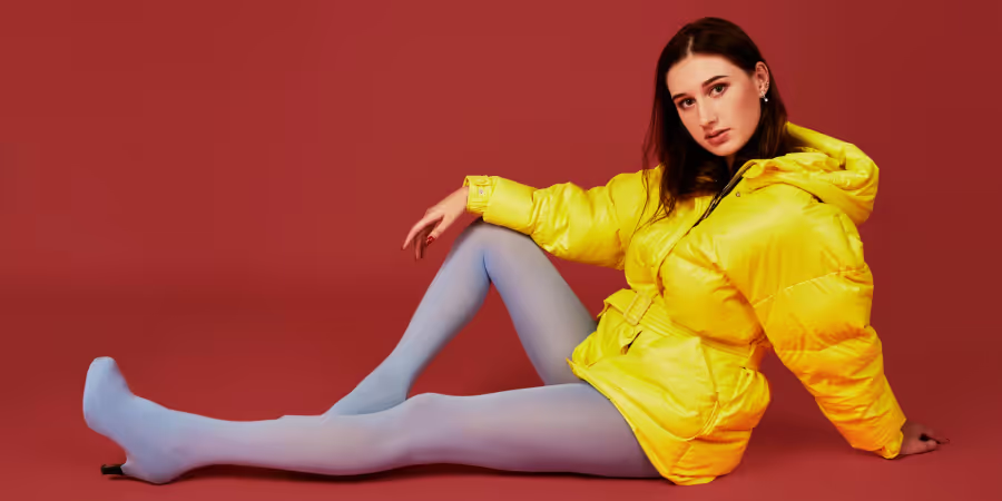 Eine Kombination, die auf den ersten Blick ungewöhnlich erscheint, aber gerade deshalb so gut funktioniert. Ein eng anliegender Sliprock wirkt dem voluminösen Look des Daunenmantels entgegen.